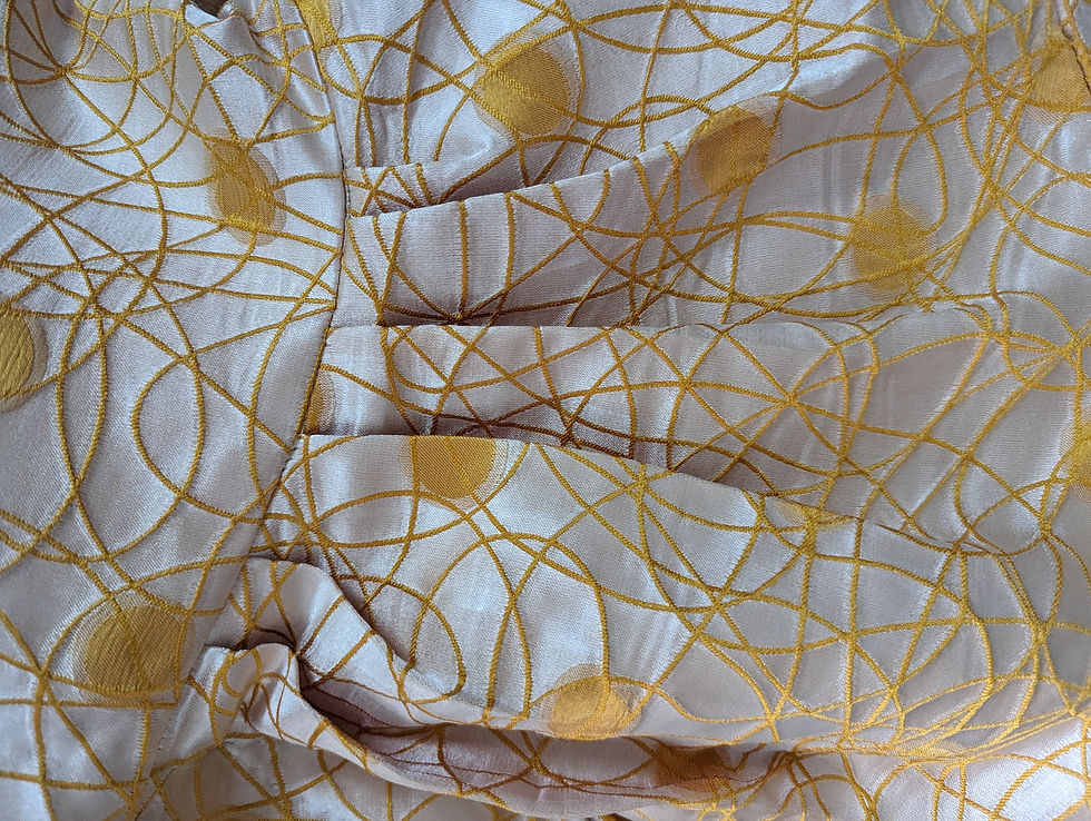 Inspired by the flowing silhouettes of Punjabi suits, its exaggerated shapes recreate the movement of Manipuri and Kathakali dances. Crafted from silk, it features a unique 3D texture created using traditional upcycled fabric and chain stitching, mimicking the intricate carvings of the Taj Mahal. This statement piece is a love letter to India, perfect for making a bold entrance anywhere you travel.